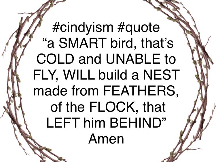 RT @texastwins2004: #cindyism #inspiration #motivation #perseverance #quotes #success #lifequotes #redneckgranny #quote “a SMART bird, that’s COLD and UNABLE to FLY, WILL build a NEST, made FROM the FEATHERS, of the FLOCK, that LEFT him BEHIND” Amen https://t.co/ggHPywLopC